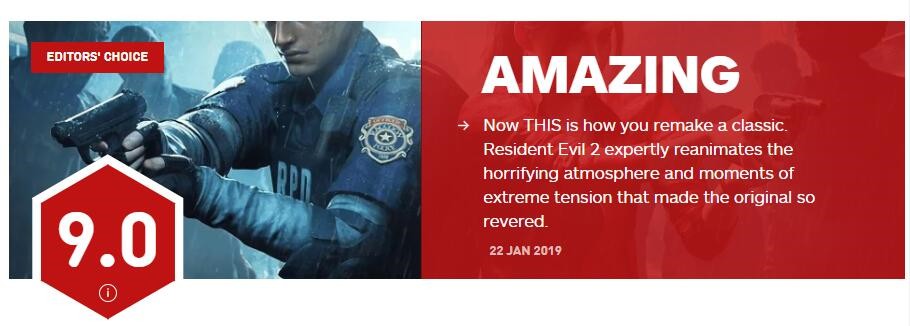 卡普空非常漂亮地重现了经典《生化危机2》所有的最佳部分,还让它不论是看起来、听起来、抑或是玩上去,都给人一种2019年游戏的感觉。如果你觉得《生化危机》系列已经“迷失”许久,那么《生化危机2:重制版》就在很大程度重现了当年的辉煌。本作的僵尸战斗令人满意,探索浣熊市的破败废墟也让人惊恐不已。但不论你选择以哪个角色通关,首次游玩全新《生化危机2》的那种游戏体验,无疑是为重制经典游戏立下了一个全新的标杆。