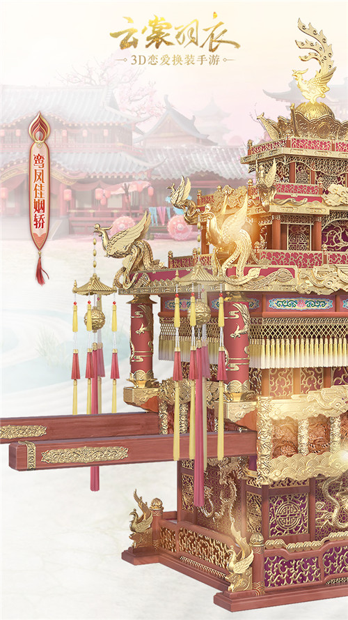 官方首先放出了鸾凤佳姻的配套背景“鸾凤佳姻轿”,这也是云裳羽衣首次将套装背景与服饰分开进行宣传,也足以彰显这个背景的华丽程度有多爆表了。喜轿顶端的鸾凤刻画的栩栩如生,由上而下宛若一座金碧辉煌的宫殿。