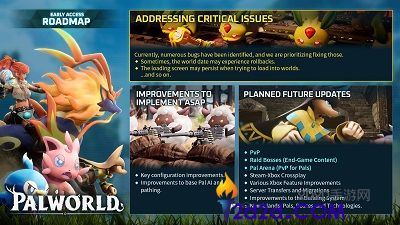 同时,他还分享了游戏刚刚发布的未来更新路线图。在路线图中,官方承诺将首要解决游戏的 BUG 和服务器等重要问题。之后游戏将添加 PvP、后期团队副本、帕鲁竞技场、Steam与 Xbox 跨平台联机以及包括新岛屿、帕鲁等更多内容。