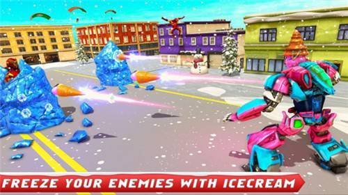 3、大战中与敌方机器人战斗并冻结敌人,消灭所有敌人,赢得城市战斗。