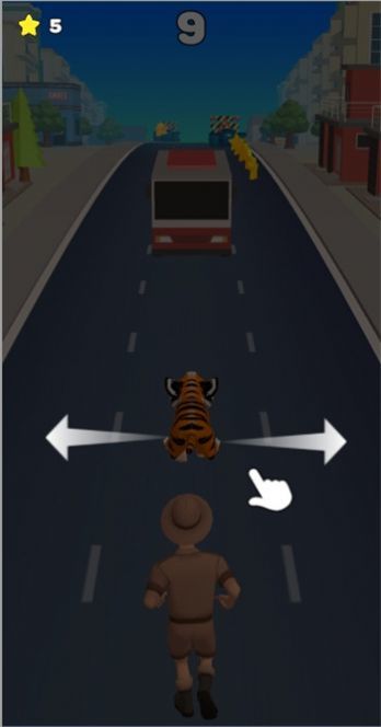 1、玩家通过左右滑动屏幕控制老虎跑动方向,上划跳跃,下滑滑行,避开障碍;