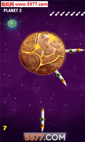 画面做的很精美的太空扔转盘游戏,火箭命中(Rocket Hit)中玩家需要根据关卡中要求的火箭数量全部扔到旋转的圆盘上,操作很简单,主要考验玩家的反应力,关卡越往后越难。