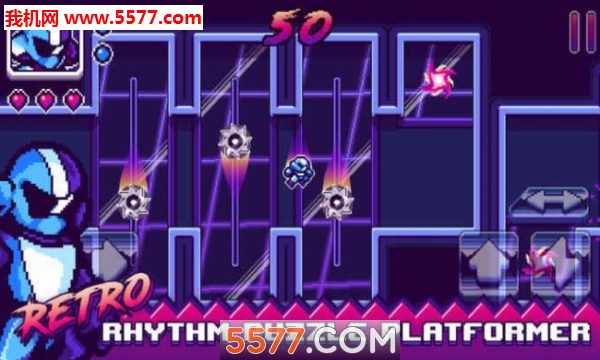游戏设计了60个关卡,包含电锯、火炮、激光等各种致命设备,而玩家只有3条命,上手难度颇高,虽然如此,独特的电子音乐还是会让你跟着节奏,反复试错,在冲刺和跳跃中停不下来。