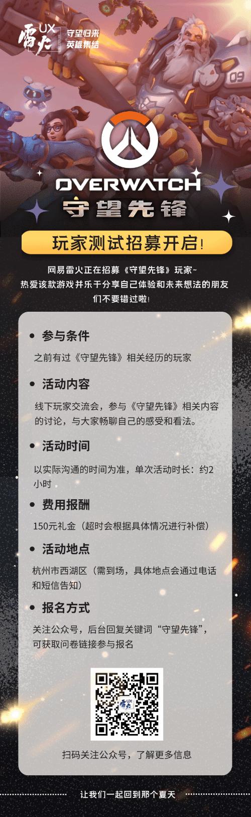 公告更新:仅限有《守望先锋》过往经验的玩家参与测试招募。活动将以线下玩家聚会的形式呈现,每次活动预计持续2小时,每位参与者还将获得价值150元的礼金。有意者赶快报名吧!
