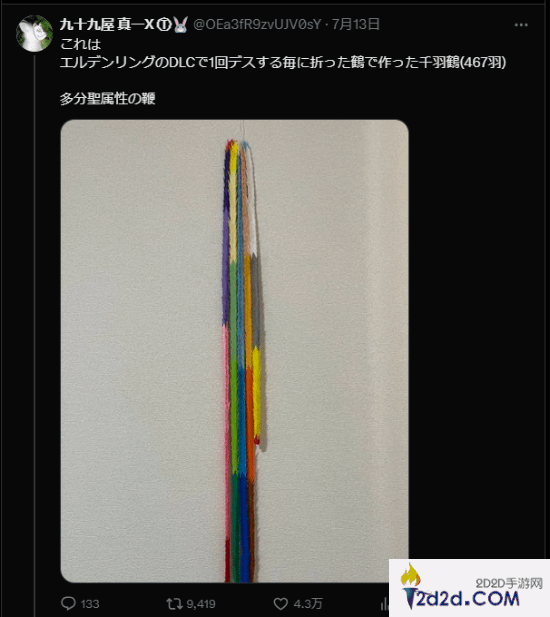 就在前天(7月13日),他终于通关了DLC,累积死亡467次,所以也折了467只千纸鹤。(说实话还挺厉害,小编感觉自己双月骑士+米塔恩就死了这么多qwq)他将所有千纸鹤拼起来做成了一条长鞭,还开玩笑说“可能是圣属性的鞭子。”