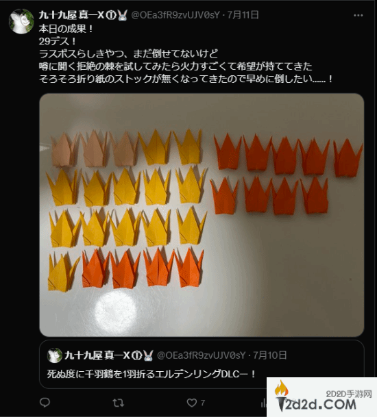 这位玩家每死亡一次就折一只千纸鹤,每天都会分享千纸鹤的照片,并且配上自己的游玩感言或是吐槽,例如“今日的战果!死了29次!虽然没打败这个看起来像最终BOSS的家伙,但是试了一下传说中的【拒绝的刺】。火力很强!让我看到了希望。折纸的存货快用完了,希望能早点打败它...”