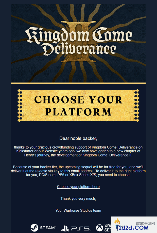 “感谢您多年前在Kickstarter或我们的网站上对《天国:救赎》慷慨的众筹支持,现在我们已进入亨利旅程的新篇章,即《天国:救赎2》的开发”文章中写到,“由于您的支持者级别,即将推出的续集将免费提供给您。在发售时我们会通过此邮箱将密钥发送给您。”