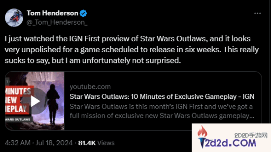 今日,我们曾报道了《星球大战:亡命之徒》的新实机演示,这段视频来自于IGN。知名爆料人Tom Henderson在看了这段实机之后,给出了自己的看法。