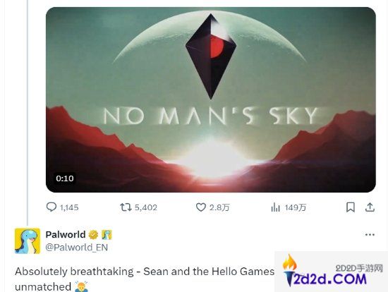 本次的更新规模巨大,而且是免费更新,《幻兽帕鲁》官方也下场互动:绝对令人叹为观止,Sean和Hello Games团队简直无与伦比。
