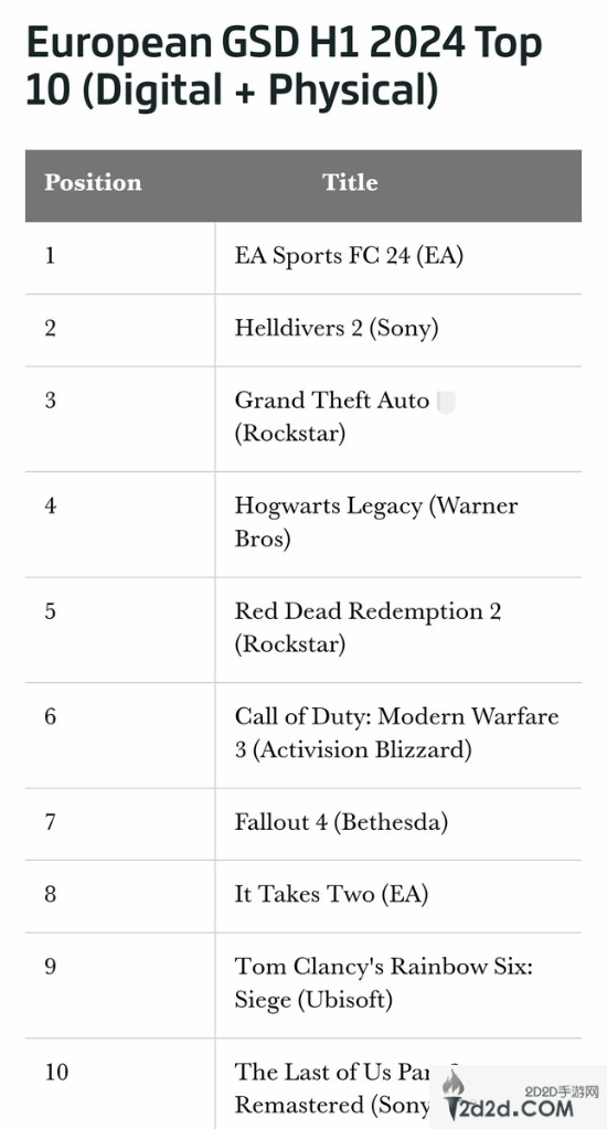 2024年上半年欧洲游戏市场销量榜出炉。其中数字+实体版游戏总销量为8000万份,同比增长390万份,主机销量为220万台。