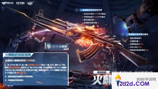参与对局后即可获得限时30天的火麒麟,想要免费获得永久火麒麟,需要在CFHD或CF任一端,每月累计10天(至少1局/天),累计3个月,才能领取非期限版。