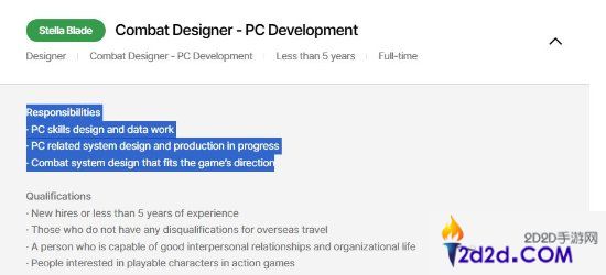 Shift Up正在专门寻找有PC平台工作经验的开发人员,这份招聘清单表明,工作室也在投入更多精力来扩展该IP,他们在聘请战斗设计师,将负责各种怪物以及动作系统设计,这可能意味着新内容正在开发中。