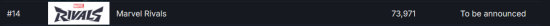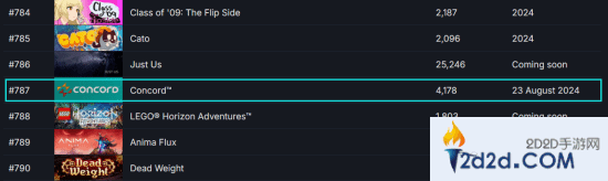 如今,距离游戏正式发售仅剩一个月。截止发稿前,据数据统计网站SteamDB页面显示,《星鸣特攻》在Steam愿望清单页面的排名仅为787名。有外媒表示,这对于一款3A级游戏来说是非常令人担忧的,即便是没有发售日期的游戏,其排名也比《星鸣特攻》高。而作为《星鸣特攻》的竞争对手,《漫威争锋》在清单页面的排名则为14名。