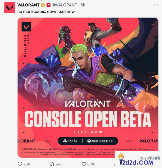 今日,拳头游戏宣布FPS游戏《无畏契约》公测版现已登陆PS5和Xbox Series X/S主机,无需激活代码。游戏支持主机间的跨平台对战。