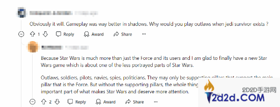 评论区有玩家表示,如果要将《亡命之徒》与《星战》系列的其他游戏比较的话,《星球大战 绝地:幸存者》似乎要比《亡命之徒》要好得多。“要我选的话肯定是去玩《影》。当《幸存者》存在的时候,为什么我非要去扮演一个逃犯?”