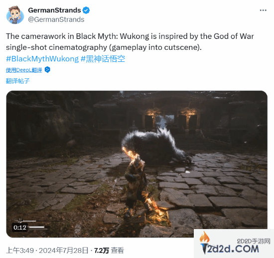 GermanStrands引用了一段悟空挑战BOSS灵虚子的画面,并表示《黑神话:悟空》的运镜手法来源于《战神》的单镜头摄影(从实机无缝切入到过场动画)。
