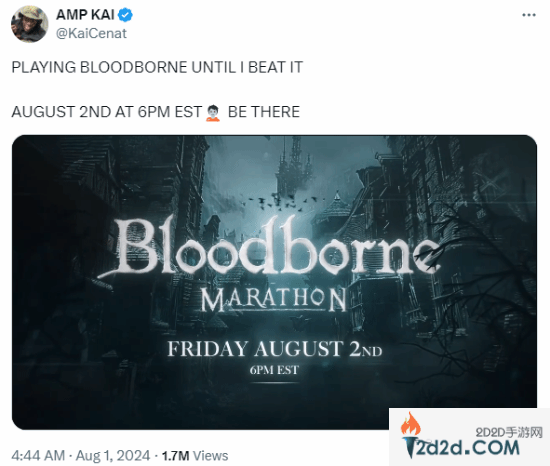 Twitch知名主播Kai Cenat今日在推特上宣布,他将于当地时间8月2日开启《血源》的直播马拉松挑战,不通关不下播,希望利用自己的影响力来推动游戏重制和移植。