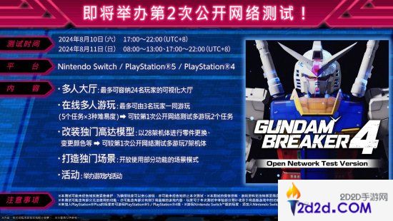 今日(8月2日),万代南梦宫娱乐宣布《高达破坏者4》即将于2024年8月10日、8月11日在PS5、PS4、Switch和Steam平台开放第二次公开网络测试。