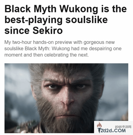 距离游戏科学巨作《黑神话:悟空》发售还有不到20天的时间,今日外媒PCGamesn的编辑Cameron Bald发布了一篇文章,并表示在游玩了两个小时的《黑神话:悟空》后,自己认为《黑神话:悟空》是继《只狼》以来最好的类魂游戏。