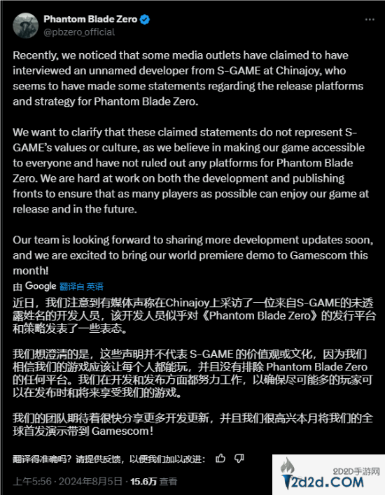 “我们想澄清的是,此前那些流传的声明并不代表S-GAME的价值观或文化。”推文中写道,“因为我们相信应该让每个人都能体验到我们的游戏,而且我们没有排除《影之刃零》的任何平台。”
