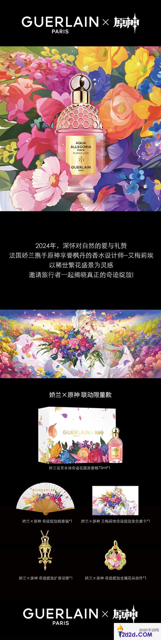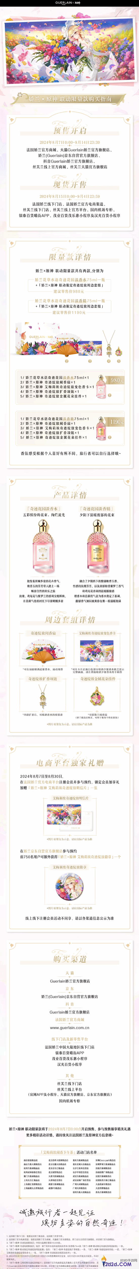 除此之外,《原神》同日还宣布将与法国娇兰香水品牌合作,推出“娇兰×原神 联动限量款”香水,香水将于8月7日0点开启预售,角色限定礼和城市特展活动也将在8月7日正式开启,感兴趣的玩家可以查看下图。