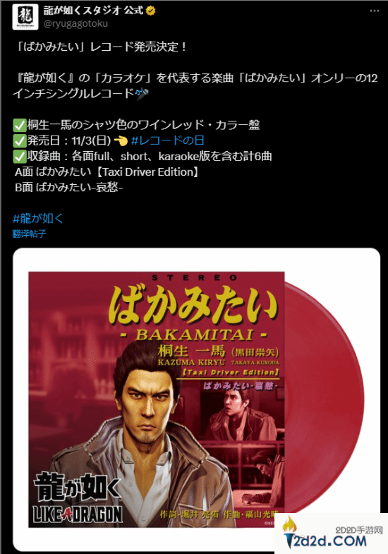 今日,《如龙》官方在推特发文称,《如龙》系列代表性曲目《像笨蛋一样(ばかみたい)》将推出12英寸单曲黑胶唱片,预计将于11月3日发行。