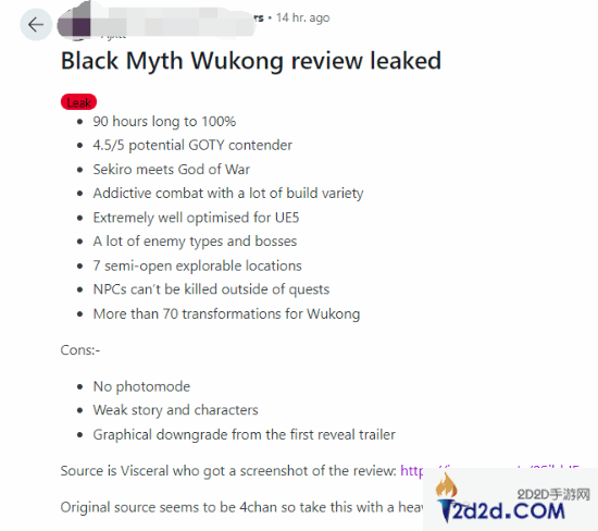 今日,Reddit上有用户分享了一篇疑似泄露的《黑神话:悟空》评测,据称来源是并不可靠的4chan,因此仅供参考。