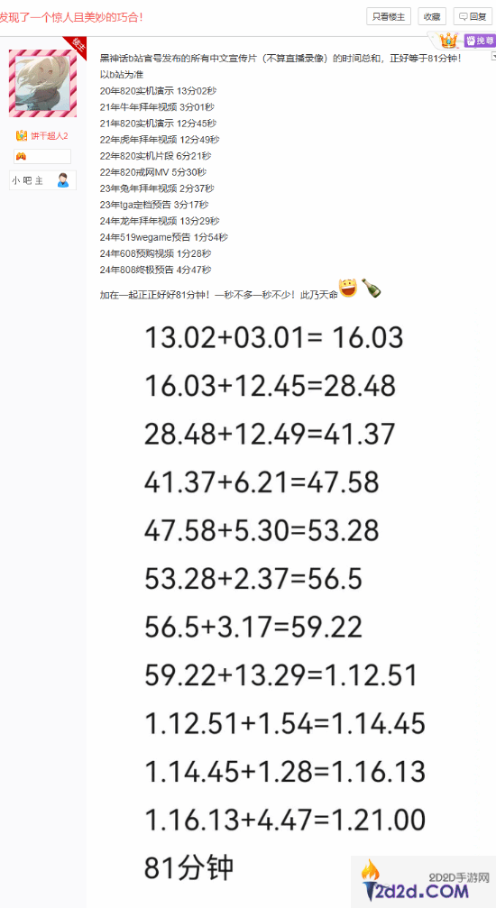 近日有贴吧吧友做了一次有趣的统计,统计内容为《黑神话:悟空》B站官方账号发布的所有中文宣传片(不算直播录像)加在一起的总时间。结果发现,所有中文宣传片的时间总和不多不少,正好等于81分钟!