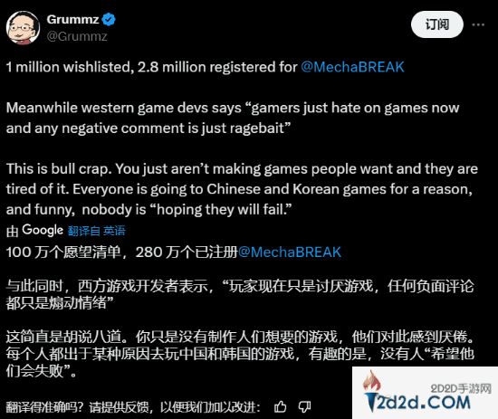 “100万人将其加入Steam愿望清单,280万人已预约。”Grummz在推文中提到,“(在《解限机》取得这样成绩的)同时,西方游戏开发者却表示,玩家现在只是讨厌游戏,任何负面评论都只是煽动情绪。”