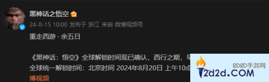 距离《黑神话:悟空》正式发售还剩五天时间。游戏官博今日发文宣布《黑神话:悟空》全球解锁时间现已确认,西行之期,早早知悉。全球统一解锁时间:北京时间 2024年8月20日 上午10点整。