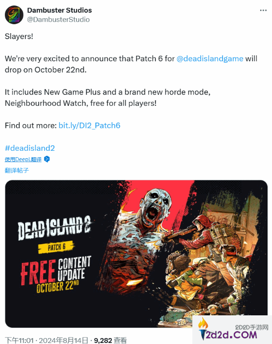 8月14日,开发商Dambuster Studios正式宣布《死亡岛2》的第六个补丁将于10月22日发布,并包含“新游戏+”与全新的合作部落模式“Neighborhood Watch”,所有玩家皆可免费游玩。