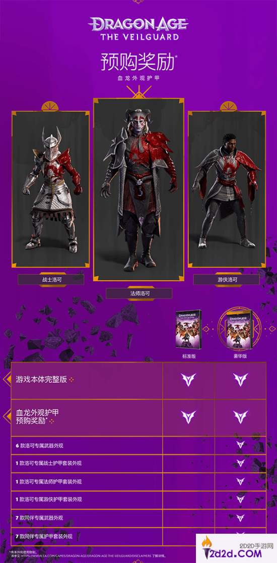 预购豪华版可获得战士、法师和游侠全部 3 种兵种的血龙护甲外观。这款护甲上的血色印迹带你回顾《龙腾世纪》前作,将永不褪色。