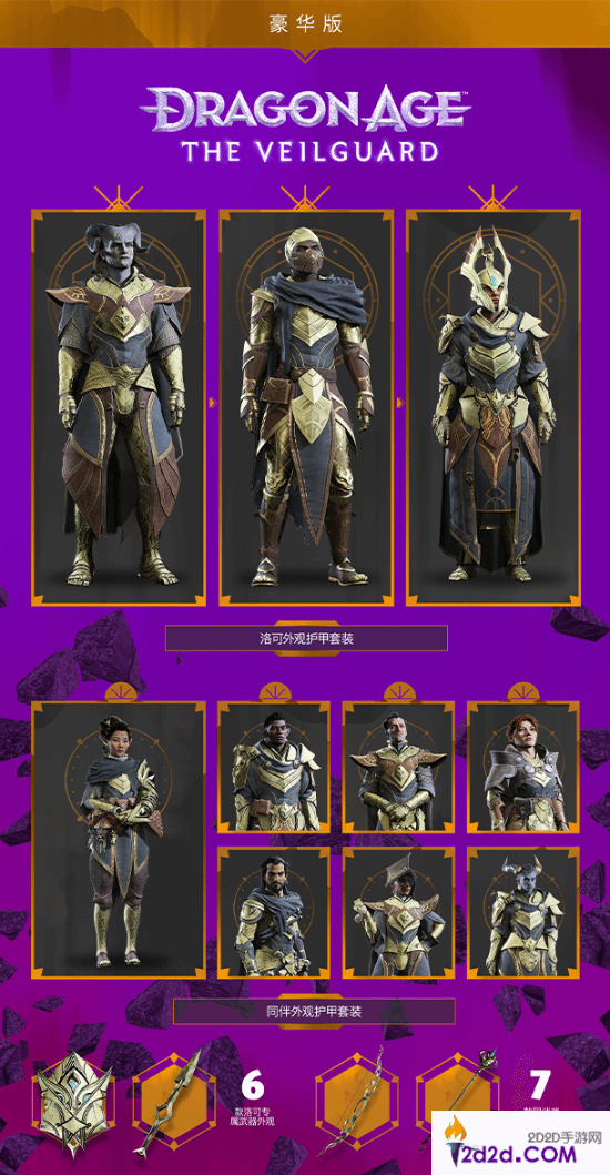 使用豪华版获得各种武器和护甲外观,包括来自一个被遗忘时代的珍宝。你将获得战士、法师和游侠各个兵种的外观武器和护甲套装,以及为 7 名同伴中每位同伴准备的外观护甲套装和武器,即 3 款洛可专属护甲套装、6 款洛可专属武器、7 款同伴护甲套装以及 7 款同伴武器——拯救塞达斯从未如此充满希望。