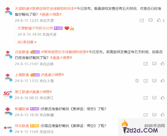 不光中国联通一个号,各地区联通账号也纷纷下场转发,这波《黑神话》宣传的热度可是拉满了。在游戏发售后,中国联通可能会与《黑神话》有联动活动。