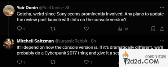 还有人问到了PS5版的问题,他表示自己不清楚PS5版怎么样,但他认为游科没有提供PS5版来评测是一个危险的信号。如果主机版和PC版有显著的不同,他们会像之前《赛博朋克2077》那样,单独打分。