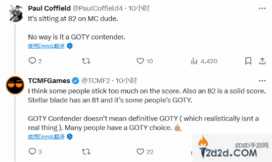 在评论区,有玩家认为按照目前《黑神话:悟空》在M站均分来看的话,它不可能被称为年度最佳游戏的竞争者。TCMF2则表示:“我认为有些人太在意分数了。82分也是一个实打实的分数,你看看《剑星》为81分,但它也是一些玩家心目里的年度最佳。实际上,“年度最佳游戏竞争者”也并不是说就确定了某一款游戏为年度最佳,每个玩家心目里的年度最佳游戏都是不一样的。”