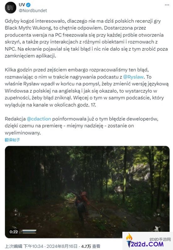UVograch于今日再次发推,表示在收到反馈后,游戏科学已经修复了相关问题,现在用波兰语也能直接玩了。