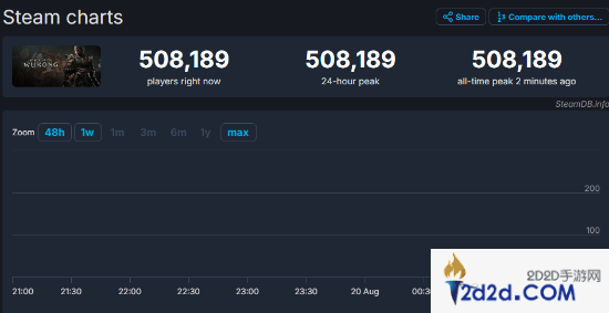 截至发稿,据Steamdb数据显示,游戏上线仅仅不到30分钟,Steam峰值人数就已达到50万8189人,预计随着更多玩家进入游戏,该数字还会持续上涨。