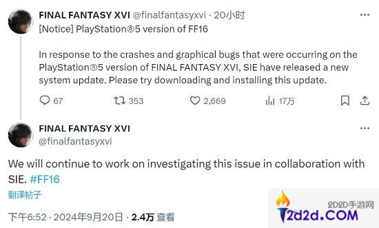 根据更新说明,系统新版本“改进了系统软件的性能和稳定性”。而FF16官方推特确认,这次PS5系统更新旨在解决游戏的崩溃和画面问题,此外,官方也表示会继续与SIE合作调查问题。