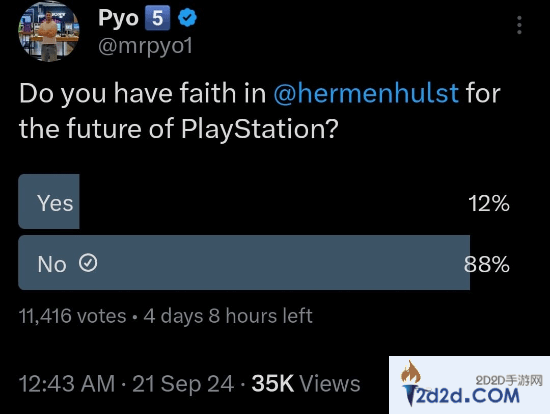 虽然Jim Ryan治下的PlayStation并不完美,但新负责人Hermen Hulst似乎更让人担忧。知名推主Pyo近日发布的调查显示,10000多名投票者中有88%的人不相信Hermen Hulst能够带领PlayStation走上正确的道路。
