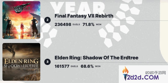 与之相比,排在第二位的《最终幻想7:重生》支持率为71.8%,第三位的《艾尔登法环:黄金树幽影》68.6%。