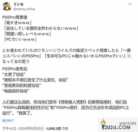 许多此前考虑转向PC的玩家因此改变了主意。一位网友@narou_zinka在推特上写道:“PS5 Pro发布后,大家还在吐槽‘太贵了’、‘升级变化太少’,甚至说‘还是PC更好’。结果《怪物猎人:荒野》配置要求一出来,大家又开始说‘PS5 Pro性价比最高’,因为普通PC根本带不动这款游戏,还是买PS5 Pro算了,真是搞笑。”