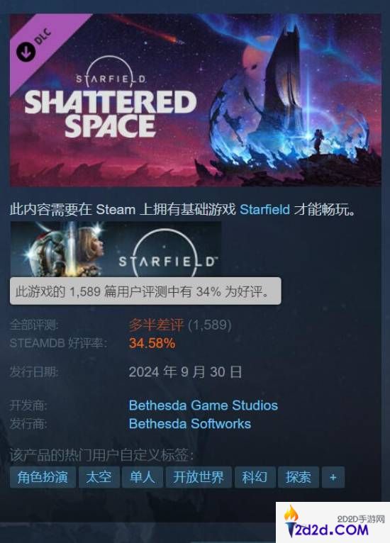 《星空》DLC“破碎空间”在Steam的评价已由“褒贬不一”跌至“多半差评”,目前有1589篇玩家评测,好评率仅为34%。