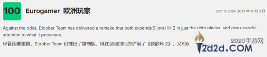 Eurogamer也给出了100分的评价,认为尽管困难重重,但Bloober Team仍在恰当的地方对原作进行了良好的扩展。