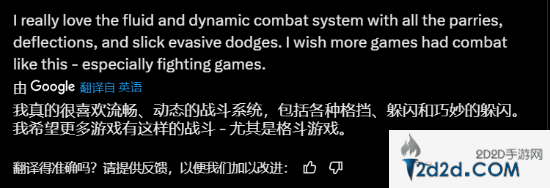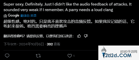 此外还有网友表示,虽然他认为本作“超级性感,绝对的”,但是不太喜欢攻击音效反馈,觉得听起来太软弱无力了:“格挡需要响亮的铿锵声。”
