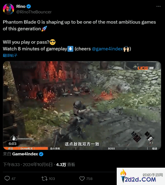 近日,知名博主@RinoTheBouncer在推特分享了来自UCG的《影之刃零》实机试玩视频,并称赞道:“《影之刃零》有望成为本世代最雄心勃勃的游戏之一,你会去玩吗?”