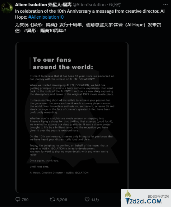 2014年的恐怖游戏《异形:隔离》在最近迎来了发售十周年纪念日,游戏曾获得极高评价,却因销量等问题被认为不会推出续作。然而周年之际,游戏创意总监Al Hope宣布粉丝们期待已久的续作终于要来了。她表示,续集目前“处于早期开发阶段”,不能公布其他细节。Hope的消息很快被《异形:隔离》官方与开发商Creative Assembly分享,证实了其真实性。