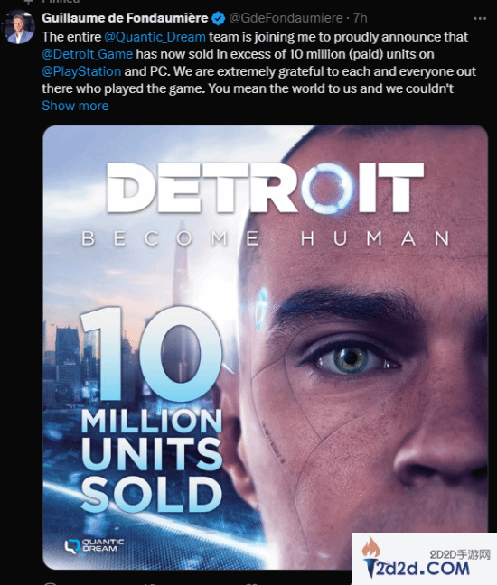 今天凌晨,Quantic Dream联合首席执行官兼联合创始人Guillaume de Fondaumière宣布,《底特律:化身为人》全球销量现已突破1000万套。