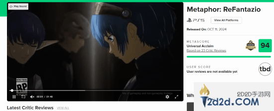 文章中提到:“在海外评分网站Metacritic上,《暗喻幻想:ReFantazio》获得了Xbox版92分,Windows/Steam版91分、PlayStation5版94分的好成绩,其中PS5版的94分是2024年目前所有作品中的最高分。终于要在本周10月11日发布了。非常感谢!”
