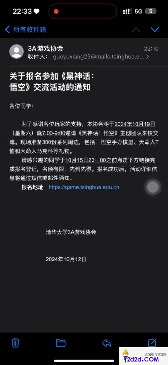据抖音博主@紫羽公主 发布的视频,这封“钓鱼邮件”中提到清华大学“3A游戏协会”会在10月19日邀请《黑神话》主创团队来校交流,而且现场准备悟空手办、天命人T恤和天命人马克杯等礼物,感兴趣的同学可以点击下方链接报名登记。
